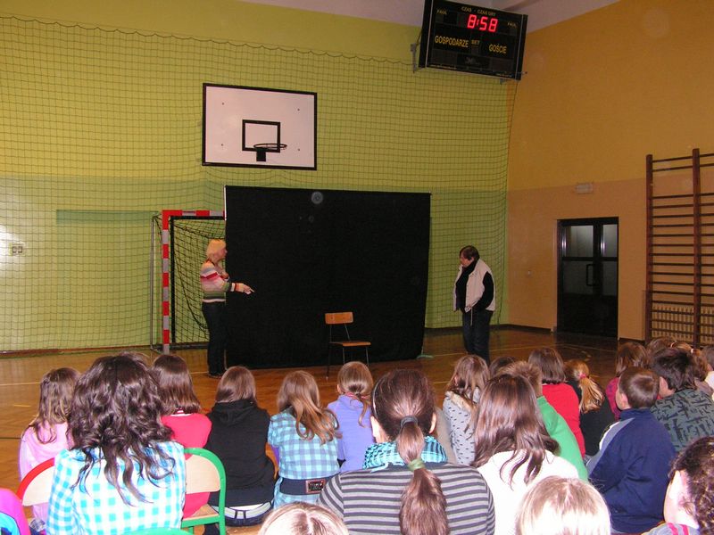 WYSTĘP ILUZJONISTY 12 maja 2008 r. w naszej szkole gościł iluzjonista. Zebranym na sali gimnastycznej przedszkolakom, uczniom szkoły podstawowej oraz młodzieży gimnazjalnej zaprezentował swoje umiejętności w dziedzinie "magii". Był to pokaz niezwykłej zręczności, a może prawdziwych czarów. Różne przedmioty w przedziwny sposób znikały w rękach naszego gościa, by po chwili pojawić się w niespodziewanym miejscu, na przykład w uchu jednego z uczniów. Mocne węzły na grubych sznurach rozwiązywały się za jednym pociągnięciem sprawnej dłoni, karty zmieniały swoje położenie, a woda w magicznych czarkach raz pojawiała się, raz znikała. Magik spośród zgromadzonych na sali uczniów wybrał asystentów, którzy mieli pomagać mu w prezentowaniu różnych sztuczek. Publiczność nagradzała każdy udany trik gromkimi brawami, a niekiedy wybuchami śmiechu. Po skończonym występie nie było końca pytaniom, kiedy iluzjonista odwiedzi naszą szkołę ponownie. mgr Anna Zych