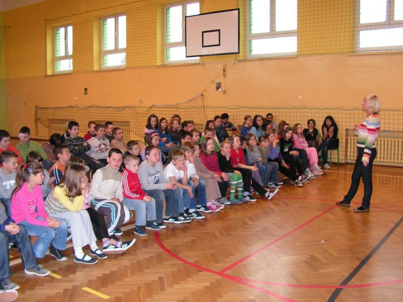 Ziemia nie jest własnością człowieka! Zobacz więcej.... SPEKTAKL PROFILAKTYCZNY LEKCJA OTWARTA Z JĘZYKA ANGIELSKIEGO "ŚWIĘTA WIELKANOCNE" 11 kwietnia 2011 r. odbyła się w naszej szkole lekcja otwarta z języka angielskiego. Wzięły w niej udział uczennice klasy V (w klasie obowiązuje podział na grupę chłopców oraz dziewczynek). Tematem przewodnim były Święta Wielkanocne, słownictwo oraz zwyczaje polskie i angielskie związane z tym okresem. W czasie lekcji kształtowano następujące umiejętności kluczowe: poprawna wymowa, formułowanie krótkich odpowiedzi, umiejętność pracy z tekstem, umiejętność posługiwania się językiem angielskim w praktyce, a także rozwijanie kreatywności, przełamywanie oporów przed używaniem języka obcego w praktyce. Podczas zajęć wykorzystano następujące metody pracy: tekstu przewodniego, metodę aktywizującą - inscenizację, ćwiczeń przedmiotowych, oglądową - pokaz, grę dydaktyczną oraz metodę praktyczną. Pani Dyrektor oraz nauczyciele obecni na lekcji pozytywnie ocenili jej zawartość oraz przebieg. Wiele satysfakcji sprawiły również aktywność i zaangażowanie uczennic podczas lekcji. mgr Sabina Krakowska Zobacz więcej.... POWITANIE WIOSNY ZMIEŃ LEŻENIE LENIUCHU NA ODROBINĘ RUCHU!!! Zobacz więcej.... ZABAWA CHOINKOWA 29 stycznia 2011 roku odbyła się w naszej szkole długo oczekiwana zabawa choinkowa. Uczniowie klas I-III bawili się w godzinach od 1000 do 1300, natomiast uczniowie starszych klas od 1300 do 1600. Liczne konkursy i zabawy uatrakcyjniły coroczny bal świąteczny. Duże emocje wzbudził pokaz mody w wykonaniu uczniów klas IV-VI. Zwycięzcami w tej konkurencji okazali się uczniowie klasy VIb, którzy podbili serca publiczności oraz jury uroczymi strojami pszczółki Mai i Gucia. Drugie miejsce zajęli uczniowie klasy VIa prezentujący fantazyjną kreację balową oraz obowiązkowy tej zimy strój dla narciarza. Kolejne miejsce przypadło w udziale uczniom klasy IV, którzy postawili na najmodniejszą w tym sezonie kratę. Z ciekawą propozycją wystąpili uczniowie klasy V. Strój kowbojski z pewnością spodobał się niejednemu chłopcu, dziewczynki z kolei zerkały z ciekawością na tajemniczą damę, skrywającą swe oblicze za piękną turkusową maską ze strusim piórem. Zabawa udała się znakomicie. Między tańcami i zabawami znalazł się też czas na chwilę wytchnienia. Rada Rodziców przygotowała dla uczniów smaczny poczęstunek: ciasta, hamburgery oraz soki. mgr Anna Zych Zobacz więcej.... WIZYTA W DOMU DZIECKA W JASIENIU 10 stycznia przedstawiciele Szkoły Podstawowej: Aleksandra Legutko, Agnieszka Jarosińska - uczennice klasy VI a, Mariola Smaluch oraz Paweł Biernat - uczniowie klasy VI b wraz z opiekunem Samorządu Uczniowskiego odwiedzili Dom Dziecka w Jasieniu. Zbieranie pieniędzy w okresie przedświątecznym na ten szczytny cel stało się tradycją naszej szkoły. Uczniowie klas I-VI już po raz czternasty chętnie włączyli się do akcji zbiórki monet w klasach. Zebrana kwota w wysokości 330 zł, słodycze oraz najlepsze życzenia noworoczne zostały złożone na ręce Pani Dyrektor tamtejszej placówki. Samorząd Uczniowski dziękuje wszystkim uczniom, którzy postanowili pomóc dzieciom z Domu Dziecka. To dzięki wam napewno spełni się jedno z marzeń waszych rówieśników. mgr Sabina Krakowska