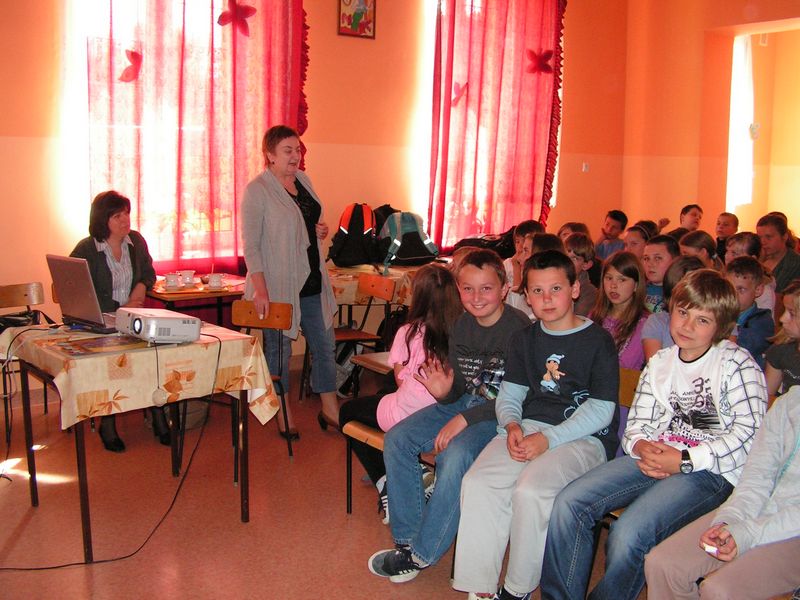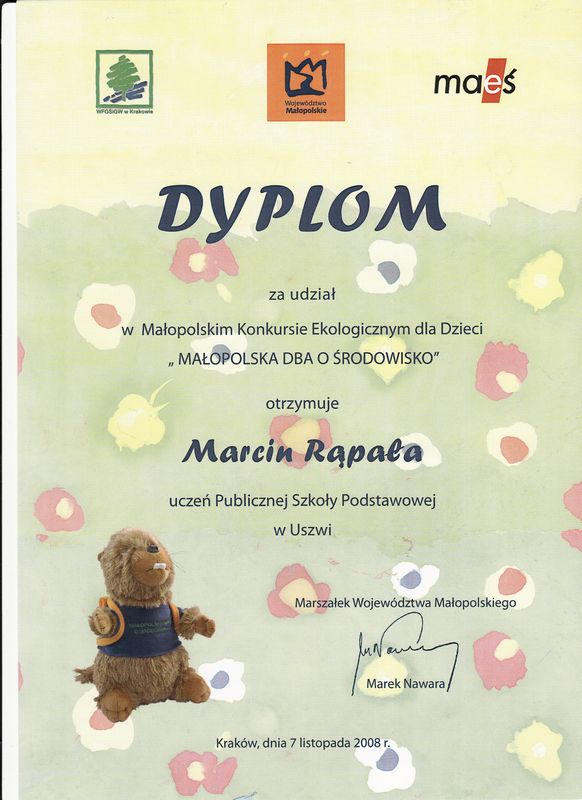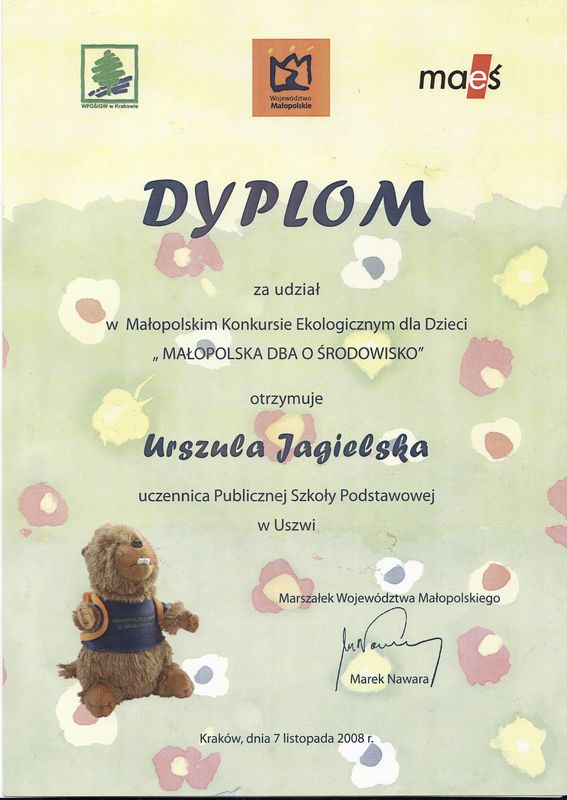30 maja 2008 roku na terenie naszej szkoły odbyła się szkolna wystawa pt. "Wielka Powódź 1997". Na jej otwarcie przybyli zaproszeni przedstawiciele władz lokalnych:Wójt Gminy Gnojnik - pan Wojciech Rzepa, Kierownik ZOSiP w Gnojniku - pani Halina Cabała, Sołtys wsi Zawada Uszewska - pani Sabina Damasiewicz, Sołtys wsi Uszew - pan Stanisław Cebula oraz Ksiadz Prałat Jan Kudłacz. Na wystawie zostały zaprezentowane prace naszych uczniów dotyczące powodzi historycznych, które nawiedziły w przeszłości Uszew, a w szczególności powodzi z roku 1997. Zebrane materiały, zdjęcia dokumentujące straty poczynione porzez żywioł, wspomnienia osób, które przeżyły powódź utworzyły ciekawą ekspozycję. Podczas wystawy doszło również do rozstrzygnięcia konkursu o tematyce powodziowej, w którym udział brali uczniowie klas piątych oraz klasy szóstej. Fundatorem nagród był Wojt Gminy Gnojnik, który wraz z Panią Dyrektor wręczył uczniom dyplomy i wyróżnienia. Oto lista nagrodzonych: Konkurs na Rodzinny Plan Powodziowy I miejsce - Patrycja Zych kl.Va II miejsce - Patrycja Babraj kl.VI III miejsce - Jagoda Musiał kl.Va wyróznienie - Agnieszka Smaluch kl.VI Konkurs literacki I miejsce - Arkadiusz Kaczmarczyk kl.Vb II miejsce - Martyna Kotarba kl.Vb III miejsce - Patrycja Babraj kl.VI wyróżnienia - Klaudia Rams kl.Va Eliasz Wnęk kl.VI Konkurs plastyczny I miejsce - Martyna Kotarba, kl.Vb II miejsce - Paulina Kowlaczyk kl.VI III miejsce - Izabela Biernat kl.Vb wyróżnienie - Joanna Klecka kl.VI Wystawa cieszyła się sporym zainteresowaniem. Zwiedzili ją również Dyrektor, Nauczyciele i uczniowie Publicznego Gimnazjum w Uszwi oraz rodzice uczniów i inni mieszkańcy naszej miejscowości. mgr Anna Zych "Z książką przez życie" Już od wielu lat maj jest miesiącem spotkań z literaturą, książką i jej twórcami. W ramach Dni Książki uczniowie naszej szkoły przygotowali w dn. 28 maja apel zatytułowany "Z książką przez życie". Było to żartobliwe ale z drugiej strony pouczające przedstawienie, którego celem było propagowanie czytelnictwa oraz kształtowanie szacunku dla książki, jako źródła wiedzy. W programie znalazły się informacje dotyczące historii książki, ciekawostki, wiersze, krótkie scenki: "W bibliotece" oraz "Przygoda Grzesia". Mali aktorzy zaśpiewali piosenkę "Twym przyjacielem książki" na melodię "Gdzie strumyk płynie....". Nie zabrakło także rad, jak należy się obchodzić z książką, by służyła nam jak najdłużej. Na zakończenie apelu dokonano podsumowania czytelnictwa w tym roku szkolnym. Pani Dyrektor wręczyła dyplomy klasom, które wypożyczyły i przeczytały najwięcej książek: I miejsce w kategorii klas I-III zdobyła klasa III A I miejsce w kategorii klas IV-VI zdobyła klasa IV B Wyróżnienie otrzymała klasa I za aktywne czytelnictwo. Zwycięskim klasom gratulujemy a wszystkim uczniom życzymy słowami wiersza: "Drodzy uczniowie, kochane dzieci Życzyć Wam chcemy Byście z książką żyli zawsze w wielkiej przyjaźni. Niech Was prowadzi przez morze przygód, Śmiechem szczerym smutek rozprasza. Niech będzie z Wami jej mądrość I przyjaźń przez długie, długie lata". mgr Józefa Zych SPOTKANIE Z PISARZEM 20 maja 2008 roku w naszej szkole gościł Pan Wiesław Drabik, autor kilkudziesięciu pełnych humoru, wierszowanych bajeczek dla dzieci. Spotkanie zorganizowano wspólnie z Biblioteką Publiczną w Uszwi. Uczestniczyli w nim uczniowie klas I - IV. Autor czytał najśmieszniejsze fragmenty swoich książeczek, przygotował również dla dzieci konkursy dotyczące znajomości bajek i umiejętności rymowania. Chłopcy z klasy IV: Dawid Kopeć i Adrian Pabjan zdobyli największą liczbę punktów i tym samym wygrali nagrody - książki opatrzone autografem Autora. Uczniowie mogli zadawać pytania dotyczące warsztatu pracy pisarza. Gość bardzo chętnie udzielał odpowiedzi: od kiedy pisze, ile książek już napisał, jak długo pisze się książkę dla dzieci, skąd czerpie pomysły do swoich bajeczek, czy sam je ilustruje, o jakiej porze dnia pisze, i.t.p. Na zakończenie spotkania dzieci mogły zakupić bardzo tanie książeczki i chętni ustawili się w długiej kolejce po autografy Autora. Na pamiątkę spotkania Pan Wiesław Drabik wpisał się do kroniki szkolnej. mgr Józefa Zych Międzyszkolny Konkurs Języka Angielskiego dla szóstoklasistów ,,JEDEN Z DZIESIĘCIU'' 14 maja 2008 r. w Publicznej Szkole Podstawowej w Uszwi po raz pierwszy został zorganizowany Gminny Konkurs Języka Angielskiego przeznaczony dla uczniów klas szóstych. Konkurs składał się z czterech części, w których były sprawdzane poszczególne umiejętności językowe: rozumienie tekstu czytanego, znajomość słownictwa, gramatyki oraz ogólna wiedza geograficzno - obyczajowa na temat Wielkiej Brytanii. Zadaniem uczniów było odpowiedzieć na pytania, które miały formę testu. Pierwsze miejsce zajął Jakub Cichostępski z PSP w Uszwi, drugie Kamil Stanuszek z PSP w Lewniowej, trzecie Kinga Zuchowicz z PSP w Lewniowej. Wszyscy uczestnicy otrzymali nagrody rzeczowe. Fundatorem nagród była PSP w Uszwi oraz wydawnictwa językowe Oxford University Press i Pearson Longman. mgr Sabina Krakowska