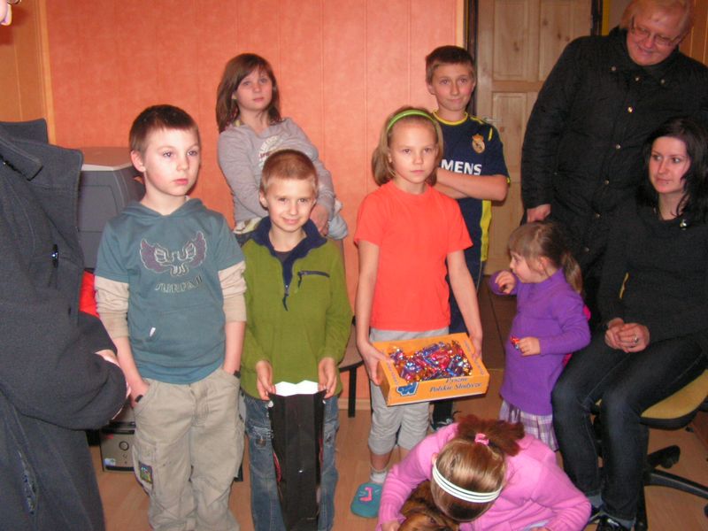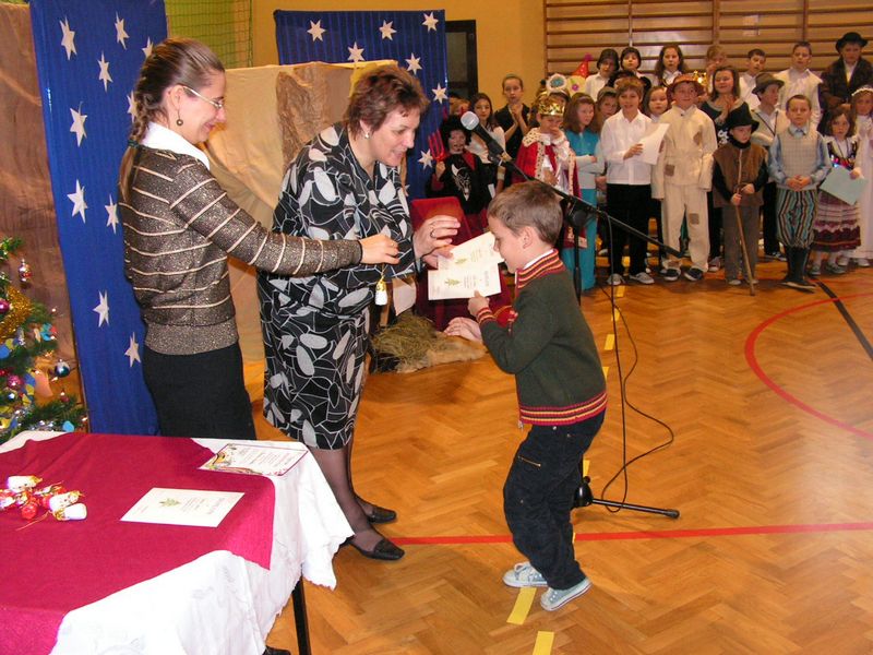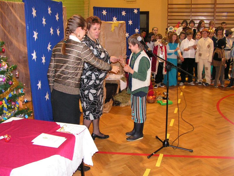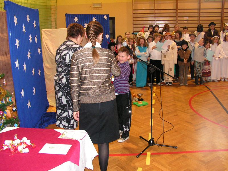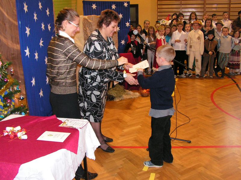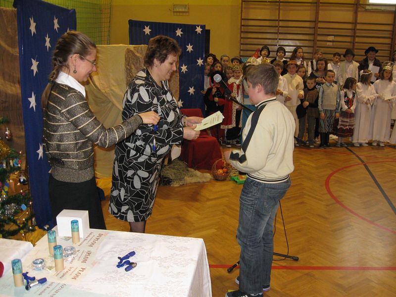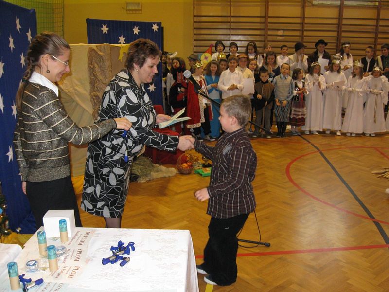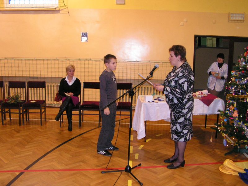 Klasa I:1. Konrad Kaczmarczyk 2. Michał Pabjan 3. Wiktoria Wąs Klasa II: 1. Natalia Golec 2. Konrad Rams 3. Natalia Wawryka 4. Patryk Zając Klasa III: 1. Kamil Niewola 2. Kinga Pabjan 3. Patryk Kałuża 4. Marcin Rąpała 5. Sławomir Toboła Klasa IVa: 1. Artur Babraj 2. Ewelina Nowak 3. Monika Zięć Klasa IVb: 1. Mariola Smaluch 2. Katarzyna Toboła 3. Szczepan Bober Klasa Va: 1. Kamil Robak 2. Grzegorz Wawryka Klasa Vb: 1. Dawid Bober 2. Grzegorz Śledź Klasa VIa: 1. Klaudia Rams Klasa VIb: 1. Krystian Baran 2. Marlena Burek 3. Arkadiusz Kaczmarczyk 4. Martyna Kotarba 5. Natalia Reczek mgr Maria Górka Nasza szkoła uzyskała od Moltiva sp. z o.o. darmowe licencje na używanie programu Emilek 2.0 dla szkół. Przedstawienie " TWÓJ DEMON - AGRESJA " 5 lutego w ramach realizacji zadań programu profilaktycznego odbyły się w naszej szkole zajęcia teatralne pt. "Twój demon - agresja" przygotowane przez Teatr Profilaktyczny "Horyzont" z Krakowa, który współpracuje z różnymi placówkami oświatowymi w całej Polsce. Przedstawienie bardzo spodobało się naszym wychowankom. Poruszało bowiem ważny problem - zjawisko agresji w szkole. Uczniowie mogli dokonać oceny różnych zachowań związanych z przemocą fizyczną czy psychiczną, a także zdobyć wiedzę, jak zachować się w podobnych sytuacjach. Ochotnicy mieli też szansę zaistnieć na scenie. Kilkoro uczniów wcieliło się w wyznaczone im przez profesjonalnych aktorów role, co wzbudziło aplauz publiczności. Dzięki tak przygotowanym zajęciom nasi uczniowie z pewnością lepiej będą sobie radzić z trudnymi emocjami - złością, poczuciem odrzucenia, agresją. mgr Anna Zych Zabawa choinkowa 17 stycznia odbyła się w naszej szkole zabawa choinkowa. Na licznie przybyłych uczniów czekała pięknie przystrojona sala gimnastyczna. Dzieci z klas I-III przebrały się w fantazyjne kostiumy. Na balu zaroiło się od postaci bajkowych; księżniczek, cyganek, klaunów, zjawił się nawet Harry Potter - słynny młody czarodziej. Uczniowie klas IV-VI zaprezentowali samodzielnie przygotowane układy taneczne, wśród których największą furrorę zrobił występ "Dody" i jej świty. Prócz tańców były także konkursy organizowane przez Samorząd Uczniowski. Wcale nie tak łatwo było ugryźć jabłko uwiązane na nitce czy nakarmić kolegę jogurtem, mając przy tym zawiązane oczy. Rada Rodziców zatroszczyła się o smaczny poczęstunek dla bawiących się pociech. Ciepłe hamburgery, pyszne ciasta i soki owocowe zaspokoiły apetyty nawet najwytrwalszych tancerzy. mgr Anna Zych Zobacz więcej.... Wizyta w Domu Dziecka w Jasieniu Już po raz dwunasty uczniowie Szkoły Podstawowej oraz Gimnazjum wraz z opiekunami Samorządu Uczniowskiego obu szkół odwiedzili wychowanków Domu Dziecka w Jasieniu. Wrażliwość na los drugiego człowieka oraz umiejętność dzielenia się były głównym celem i przesłaniem tej akcji. Dzięki ofiarności uczniów i nauczycieli obu szkół udało się zebrać kwotę 550 zł. Do życzeń noworocznych dołączyliśmy słodycze. Spotkanie z wychowankami Domu Dziecka oraz Panią Dyrektor przebiegło w miłej i serdecznej atmosferze. mgr Sabina Krakowska Koncert duetu akordeonistów