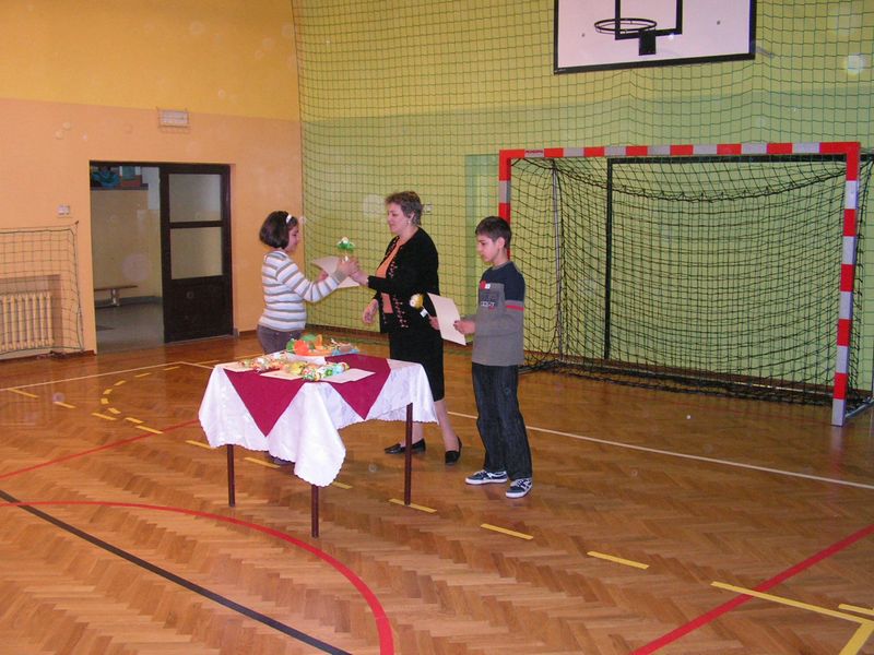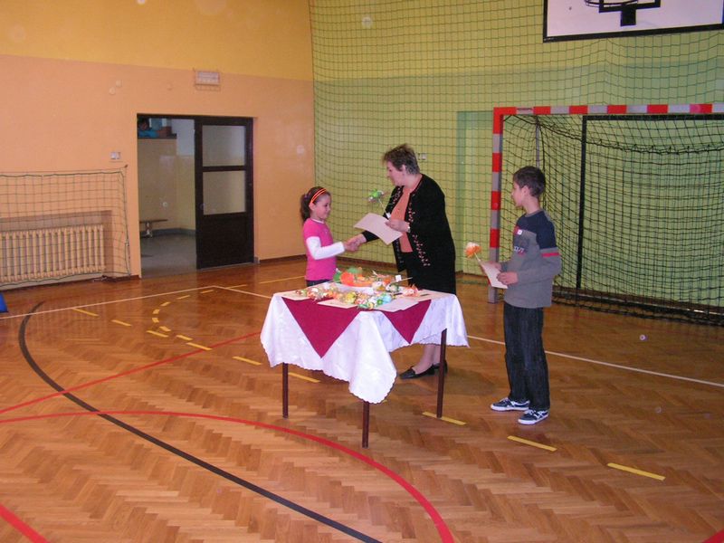 Ostatecznie w kategorii dziewcząt II miejsce i srebrny medal wywalczyła Kamila Zięć, a miejsce III i medal brązowy Natalia Kural. W kategorii chłopców trumfowali uczniowie Gosprzydowej i Gnojnika. Nasi młodzi szachiści są dopiero uczniami klas czwartych więc mają jeszcze czas i szansę zaprezentować swoje umiejętności na zawodach już chociażby za rok! Uczniowie nabywają umiejętności gry w szachy uczestnicząc w zajęciach Klubu Szachowego, który prowadzony jest w ramach szkolnego projektu "Moja szkoła oknem na świat" - wdrażanego w ramach projektu "Moja Ojczyzna tam gdzie moja szkoła" współfinansowanego przez Unię Europejską w ramach EFS. Członków klubu czekają jeszcze zmagania o tytuł Szachowego Mistrza Szkoły w kategorii dziewcząt i chłopców. Wszystkim uczestnikom zawodów szachowych serdecznie gratulujemy i życzymy powodzenia w dalszych rozgrywkach! Opiekun Klubu Szachowego : Zofia Zięć 12. 11. 2007 - zmiana w podziale godzin Od 12 listopada 2007r nastąpiła zmiana w podziale godzin. Owe zmiany wiązały się z urlopem zdrowotnym pani mgr inż. Marii Górka. Sztuka jest prowadzona przez p. mgr Teresę Czesak, technika przez p. mgr inż. Annę Nowak a informatyka przez p. mgr Martę Szczepańską. III miejsce w powiatowym konkursie plastycznym Uczennica klasy III b Izabela Klecka zajęła III miejsce w powiatowym konkursie plastycznym pt. "Zdrowie na talerzu", organizowanym przez Sanepid. W dniu 29 listopada 2007 odebrała nagrodę w postaci i przyborów plastycznych z rąk starosty brzeskiego Ryszarda Ożóga. DZIEŃ KOMISJI EDUKACJI NARODOWEJ "Żegnaj lato na rok ...." - dyskoteka na pożegnanie lata 2007! 26 września 2007 r. Samorząd Uczniowski zorganizował dyskotekę dla uczniów klas IV-VI na pożegnanie odchodzącego lata. I mimo małego żalu, że lato się skończyło impreza udała się wspaniale. Ci, którzy przyszli, bawili się świetnie przy rytmach dyskotekowej muzyki. Oprócz zabawy był też konkurs na najpiękniejszy jesienny bukiet. Każda klasa wykazała się ogromną pomysłowością wykonując wspaniałe kompozycje z przeróżnych darów jesieni. Bukiety były piękne, więc komisja oceniająca miała trudne zadanie przy wyborze tego najpiękniejszego. Ostatecznie jury zdecydowało przyznać następujące miejsca: I - klasa Vb II - klasy IVa i Va III - klasy IVb i VI Każda klasa otrzymała dyplom, a Vb dodatkowo worek słodyczy, których nie zabrakło też dla uczniów pozostałych klas. Samorząd Uczniowski zadbał również o bawiących się z ogromnym poświęceniem uczniów proponując im w bufecie pyszne zapiekanki, napoje chłodzące i słodycze. Teraz z ogromną niecierpliwością oczekiwać będziemy na lato, które przyjdzie już za rok. Samorząd Uczniowski