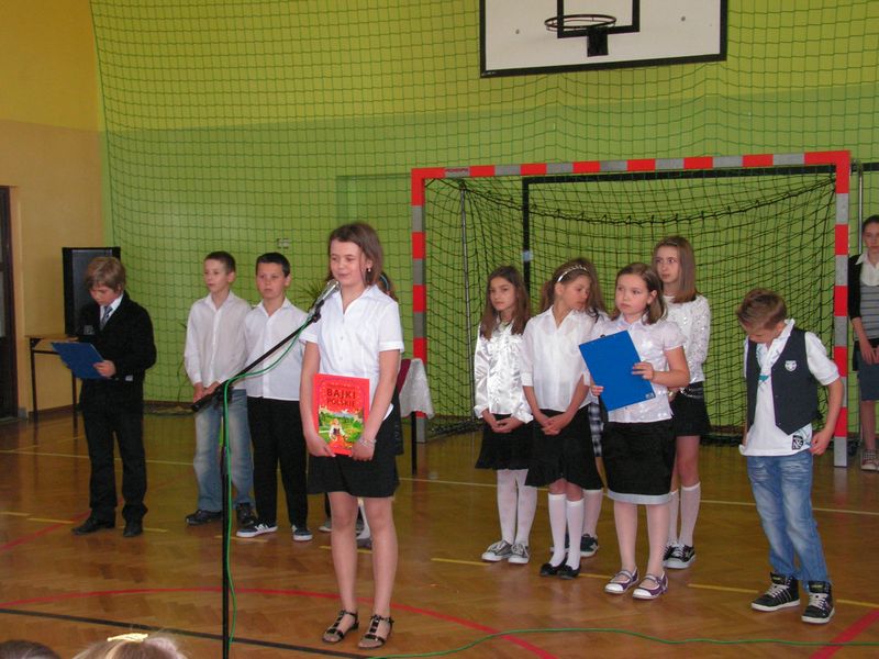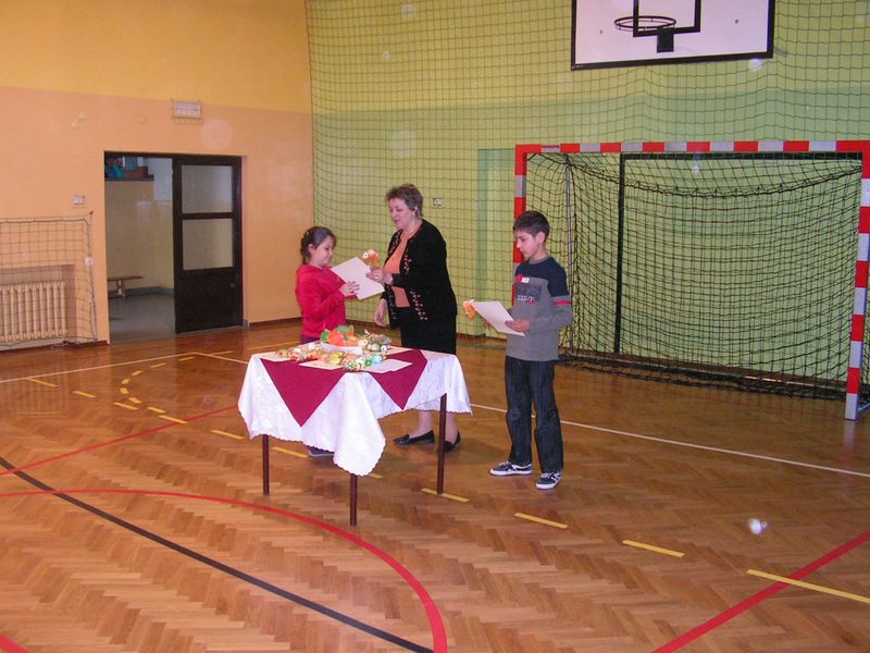 W turnieju rywalizowało 6 drużyn: - Żabki - kl. Ia i VI(dziewczęta) - Bociany - kl. Ib i VI(chłopcy) - Zajączki - kl.IIa i Va - Skowronki - kl. IIb i Vb - Pierwiosnki - IIIa i IVa - Krokusy - IIIb i IVb. Turniej przebiegał pod hasłem integracji uczniów Szkoły Podstawowej i Gimnazjum oraz wspólnej zabawy i radości płynącej z nadchodzącej wiosny, a składy drużyn tak dobrano, żeby siły rywalizujących ze sobą były wyrównane. Uczniowie brali udział w 11 konkurencjach. Były to dyscypliny sportowe (wyścigi bocianów, zajączków i baranków, wyścigi z pisanką i rzut pisanką do kosza), wiedzowe (test na logiczne myślenie, konkurs wiedzy o Świętach Wielkanocnych i związanych z nimi tradycjami oraz test odświeżający umysł na wiosnę), plastyczne ( rysowanie portretów bociana i żabki), było też specjalne zadanie dla przewodniczących klas. Za każdą konkurencję uczniowie otrzymywali punkty sumowane na tablicy wyników. W składzie jury turnieju były Pani Dyrektor Szkoły Podstawowej Bogumiła Jagielska, Pani Dyrektor Gimnazjum Barbara Kondziołka oraz Pan Piotr Rzepa. Po zaciętej rywalizacji wyłoniono zwycięzcę turnieju, którym okazała się drużyna Krokusów w składzie: uczniowie klasy IIIb Gimnazjum i IVb Szkoły Podstawowej. Dodatkową atrakcją turnieju były prezentacje układów tanecznych przygotowanych przez uczniów szkoły podstawowej. Wiosenny turniej klas podsumowały Panie Dyrektor obydwu szkół gratulując zwycięskiej drużynie i dziękując wszystkim za wspólną zabawę. Na zakończenie były życzenia świąteczne dla wszystkich, a dodatkowo uczniowie otrzymali słodkie czekoladowe jajeczka do swoich wielkanocnych koszyków. Samorząd Uczniowski