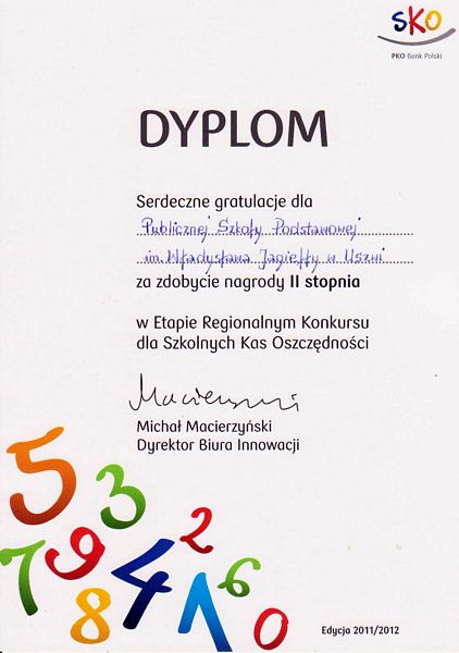 Nasza szkoła wzięła udział w konkursie dla Szkolnych Kas Oszczędnościowych (SKO) organizowanym przez PKO Bank Polski i zdobyła nagrodę II stopnia, dyplom oraz 1000 zł. Za otrzymane pieniądze zostały zakupione rolety do okien w dwóch salach lekcyjnych.